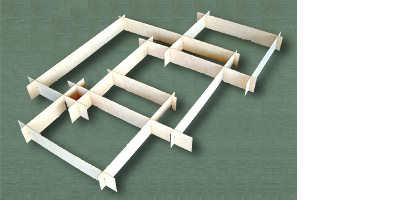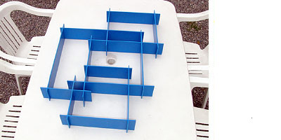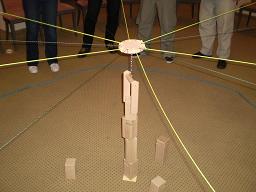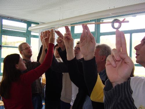 Ein verzwicktes Puzzle bestehend aus 14 verschiedenen Brettern. Es gilt in einer ersten Phase, die Teile richtig zusammen zu stellen. Wenn dies mal geschafft ist hat das Team die Aufgabe, einen "Produktionsablauf" zu entwickeln, in dem das Puzzle unter einer Minute zusammengebaut werden kann. Dies erfordert eine gute Koordination, Rollenverteilung und Kommunikation untereinander. Die Aufgabe eignet sich auch besonders gut, im Wettbewerb durchzuführen. Die Abmessungen sind so ausgelegt, dass eine Gruppe mit dem Überblick herausgefordert ist, aber die Teile dennoch im Tragekarton gut transportiert werden können.