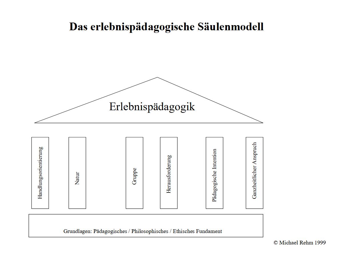 Deshalb könnte man von einem Säulenmodell sprechen. Auf einem soliden pädagogischen / philosophischen / ethischen Fundament, stehen die verschiedenen „Grundpfeiler der Erlebnispädagogik“, welche das Dach der Erlebnispädagogik tragen.